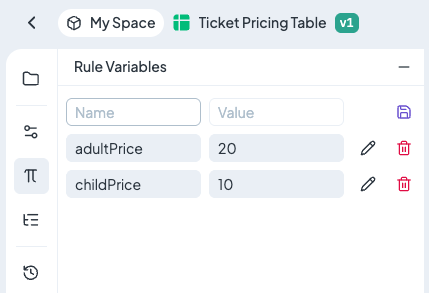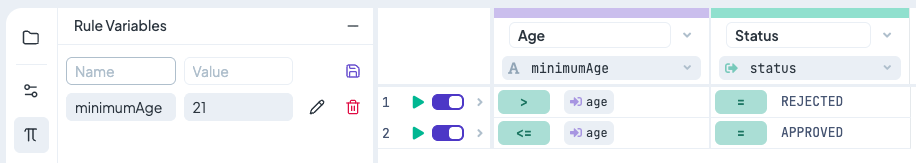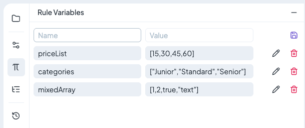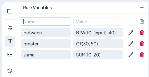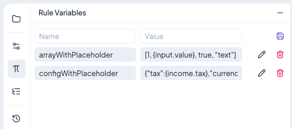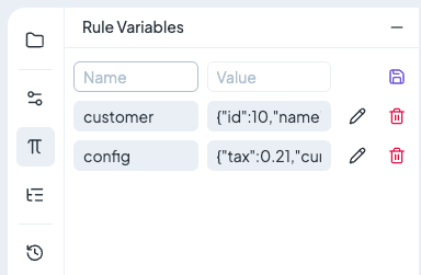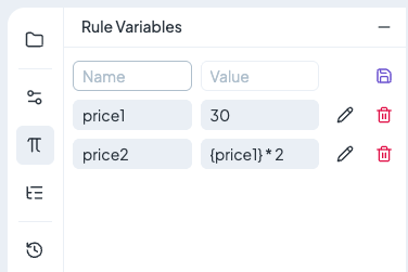 Rule Variables are managed in the **left panel** of the rule editor. Here you can add, edit, or delete variables.