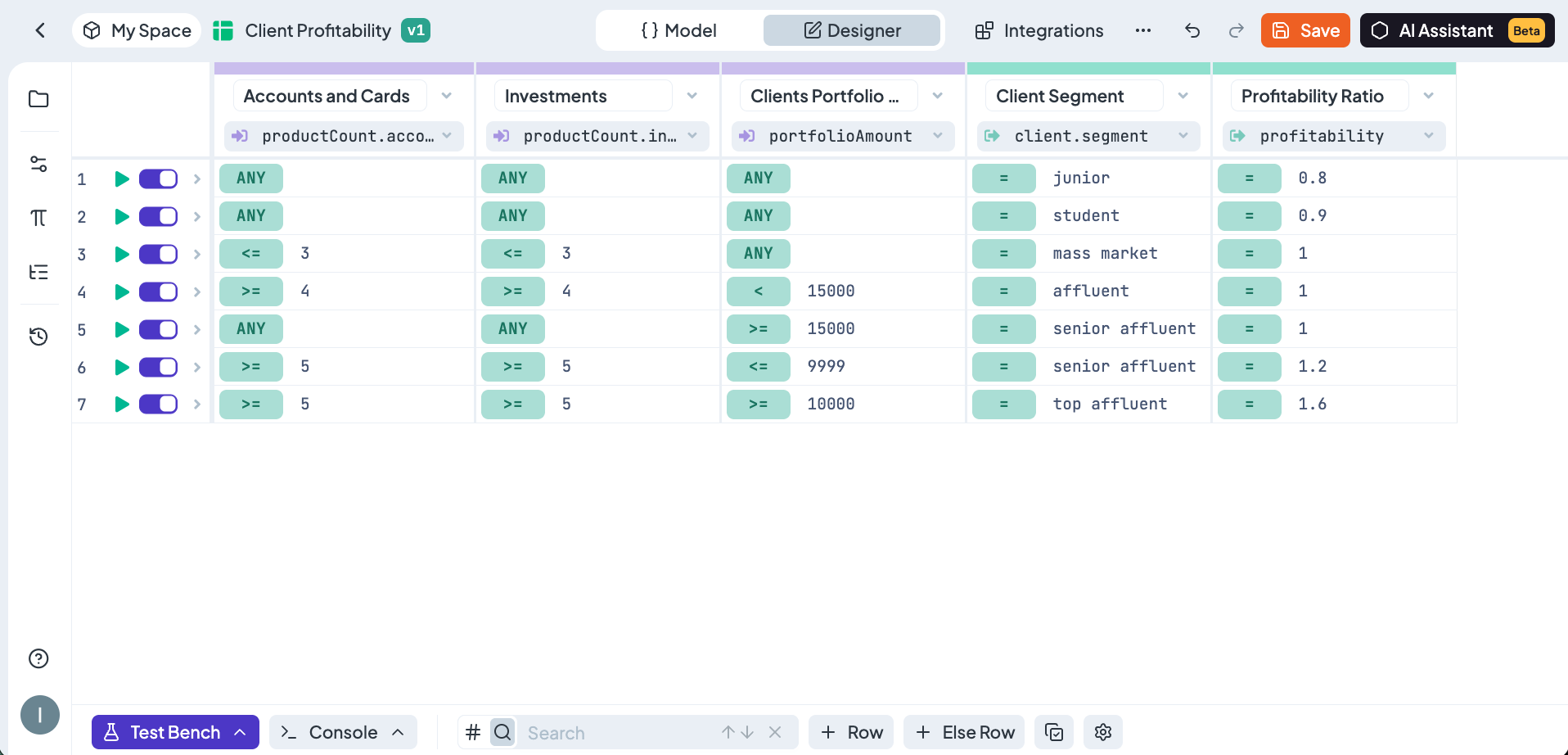 Test Bench - Built-in testing area for real-time rule validation.