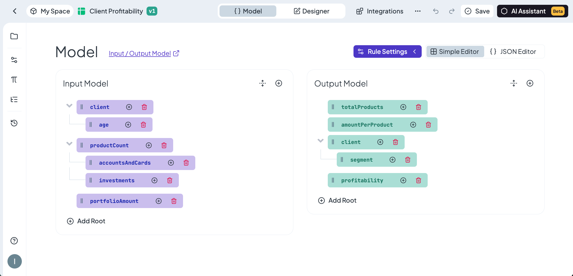 Alongside the Designer, there is a Model tab where you define your rule's Input and Output Model - the data structure your rule expects to receive and produce.