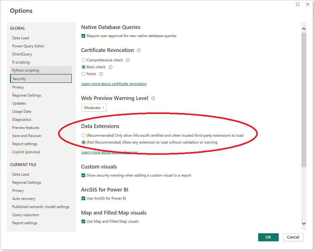 Now is the time to dive into Power BI! Open your Power BI Desktop app and go to options and settings > Options > Security. There you will find section Data Extensions. Switch from the recomended option to not recomended. You dont have to wory about any security problems. If you choose your custom connectors and data extension wisely and from trusted sources such as this documentation you won't encounter any problems.&#x20;