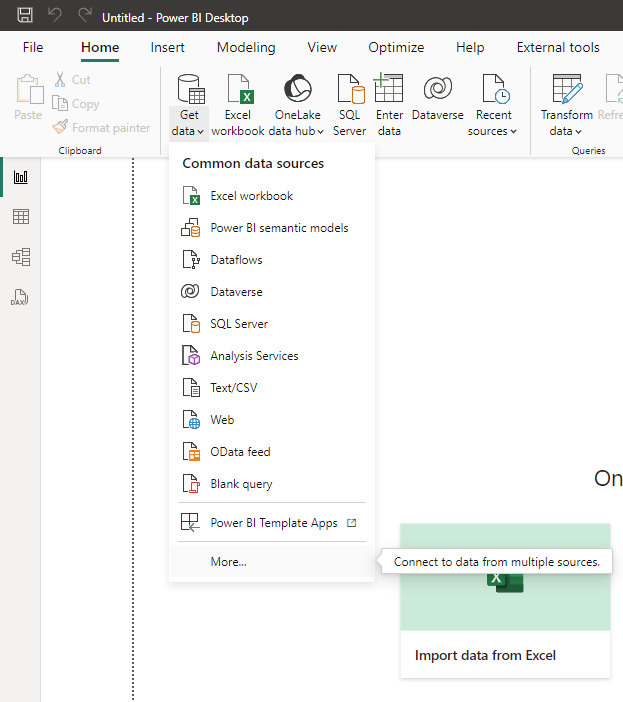 Hit OK and you will find yourself on the deafut page of a Power BI report. Let's import your data so you can later create some visualizations here.