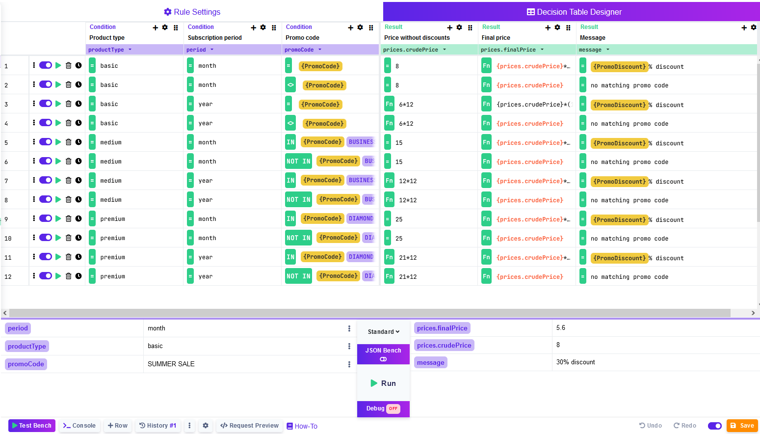 Now we can enter some input data and see what the rule does with them. Let us enter "basic" for <mark style="color:purple;background-color:purple;">**productType**</mark>, "month" for <mark style="color:purple;background-color:purple;">**period**</mark> and "SUMMER SALE" for <mark style="color:purple;background-color:purple;">**promoCode**</mark>. Upon hitting Run, we should get <mark style="color:purple;background-color:purple;">**finalPrice**</mark> equal to 5.6, <mark style="color:purple;background-color:purple;">**crudePrice**</mark> 8 and <mark style="color:purple;background-color:purple;">**message**</mark> reading '30% discount'. In other words, the rule is telling us that with the SUMMER SALE benefit code, we get 30% discount. This is the desired behavior.