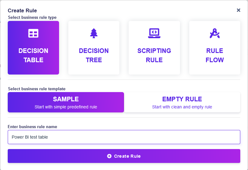 In your home folder click the option **+Create Rule,** in the following menu choose **Decision table -> Sample ,** enter a name for the table and click **Create Rule**