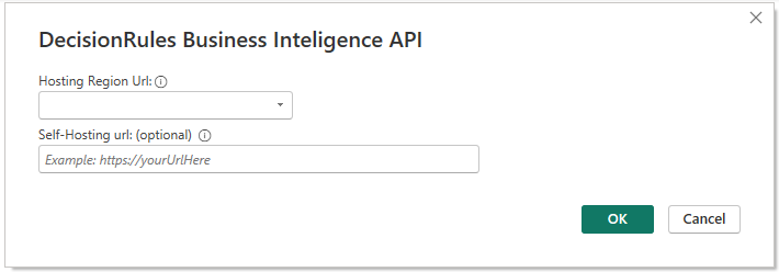 The first one is required and you will have to choose form a dropdown list. Choose the value based on the hosting region of your DecisionRules engine. In case you are hosting your DecisonRules engine on your own server choose the sefl hosting option. Next value is optional and will only be accepted if you choose the self host option. Here you have to specify the url of your Buisiness Intelligence API. Use only the base url. For further information about the Buisiness Intelligence API ook [here](https://docs.decisionrules.io/doc/v1/api/bi-api). After you filled in the values acording to your situation click OK.