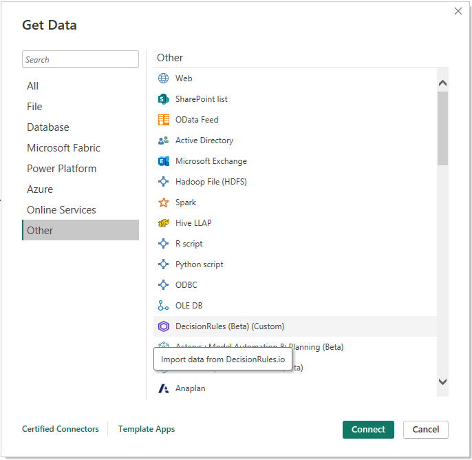 You will be presented with a list of all avalible data sources that can be accessed from Power BI. Among them you will find DecisionRules in the section Other.
