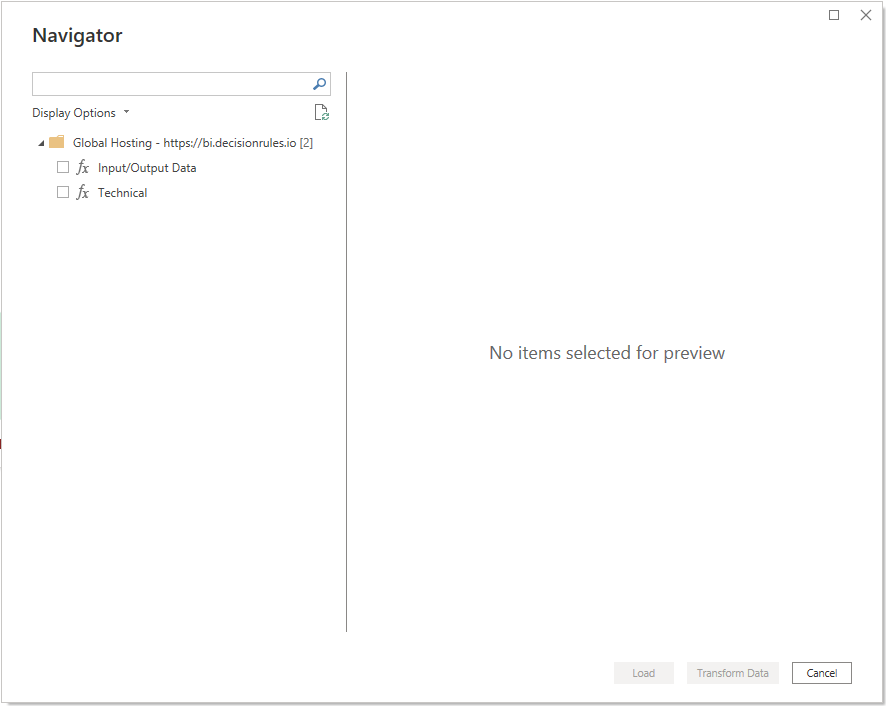 Now there are two options  bellow. 'Load' and 'Transfom Data'. The 'Load option loads data directly to the Power BI Data Model as they are returned by the data source. We do not recommend you to proceed with this option if you are not very familiar with your data. However if you know what to excpect from your data this option can be used with the techncal data as they are retrieved from the source in an acceptable format. For Input/Output Data is it always recommended to go with the 'Transform Data' option since the input and output models are enclosed within a record that needs to be further expanded and this option takes you to Power Query where you can further work on transforming your data.&#x20;