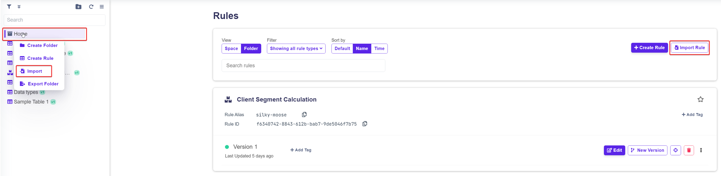Folder sidemenu: Right-click the rule for which you want to import a new version, and choose Import Version.