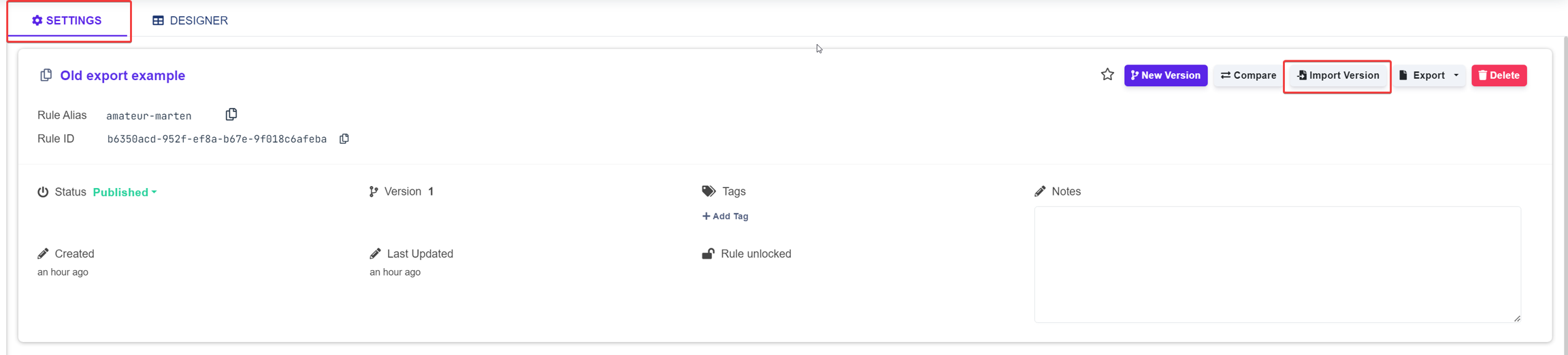 Rule settings: Click the Import Version button in the top-right corner.