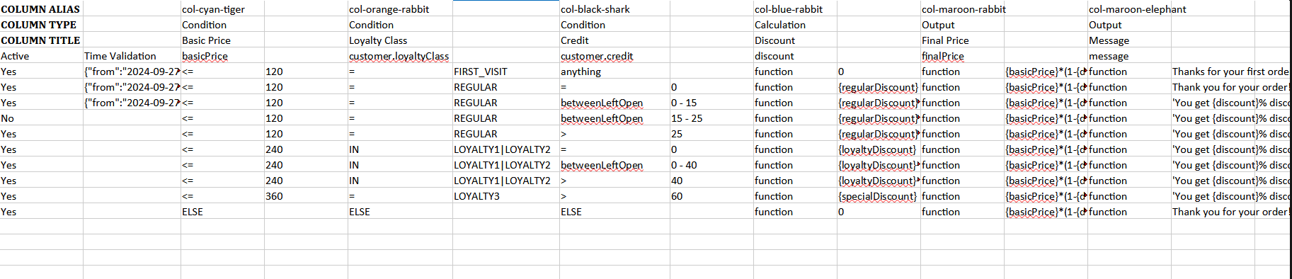 You can manage decision tables outside of the DecisionRules application for easier, faster, and clearer editing. We recommend using Microsoft Excel or Google Sheets, as they support the XLSX format.