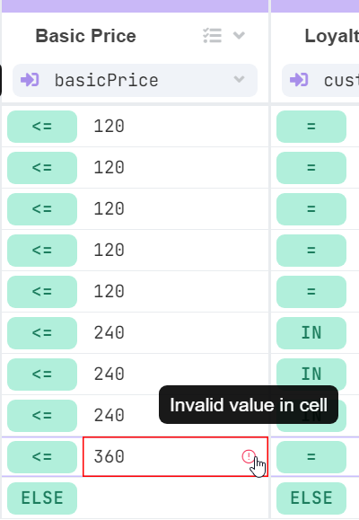 When you import the table into the app, valid values will appear in the column settings, and cells containing invalid values will be flagged: