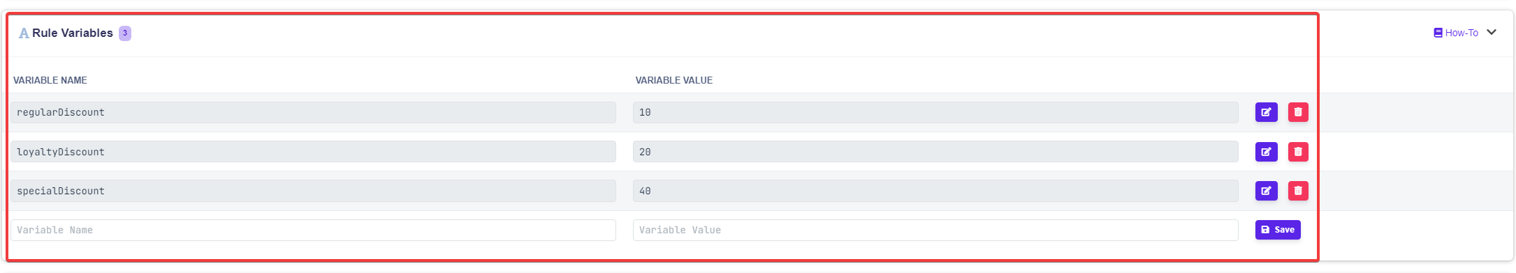 There are no mandatory elements in this section; you can define the rule variables here if needed. This section includes two columns: variable name and value, just as in the application.