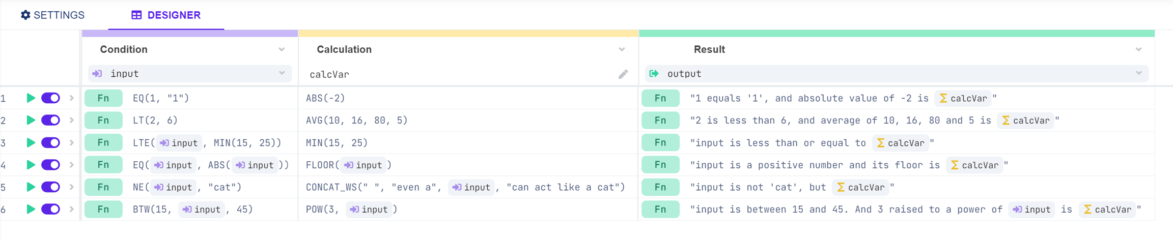 In Decision Tables, functions can be used in condition, result, and calculation columns.