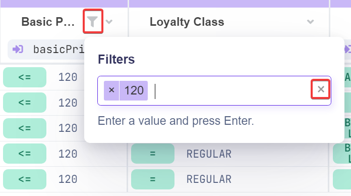 To remove a filter, click the cross icon next to the expression.