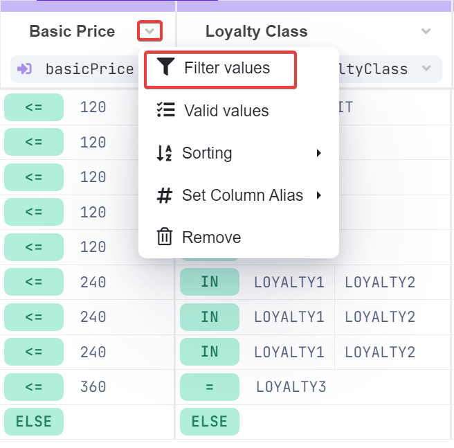 Filter Values in Decision Table