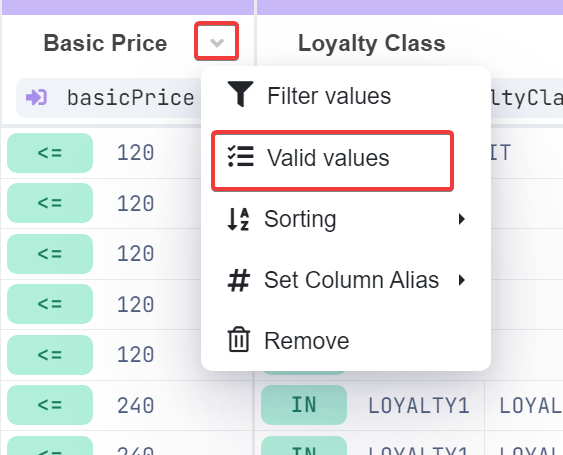 Access Valid Values: Click the arrow icon in the header of the column, then select Valid Values.