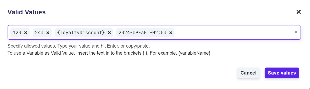 Set Valid Values: In the modal that opens, type the valid values you want to apply to the column. Press Enter to confirm each value.