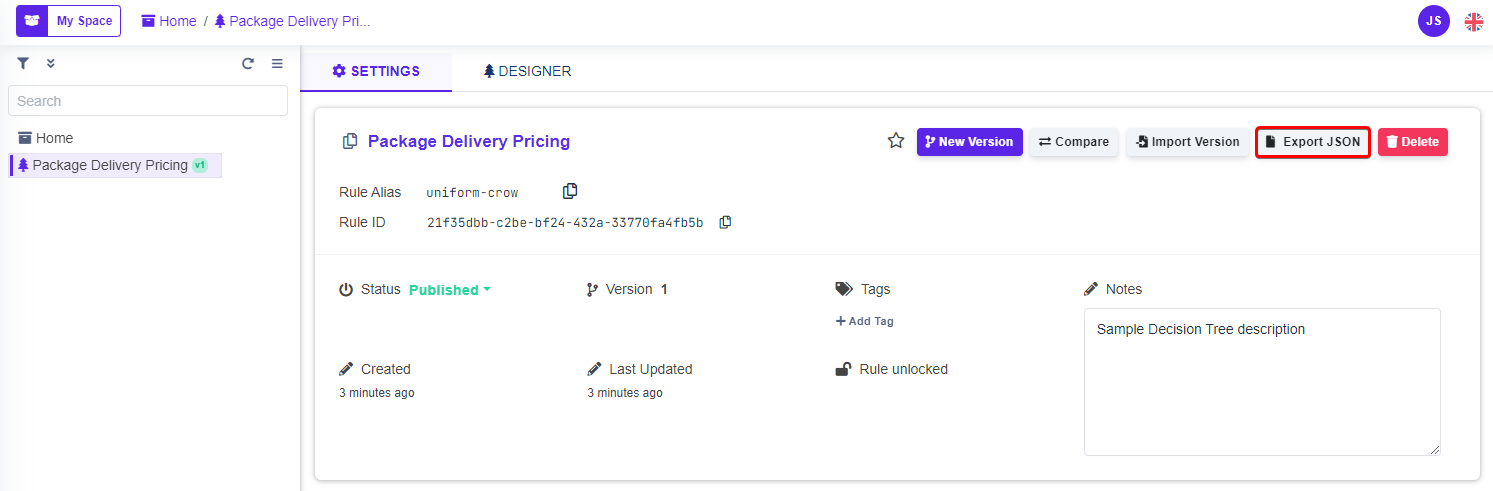 * Navigate to the rule you wish to export and into it's settings, then click on **Export** in the top right corner. (Image 2)&#x20;