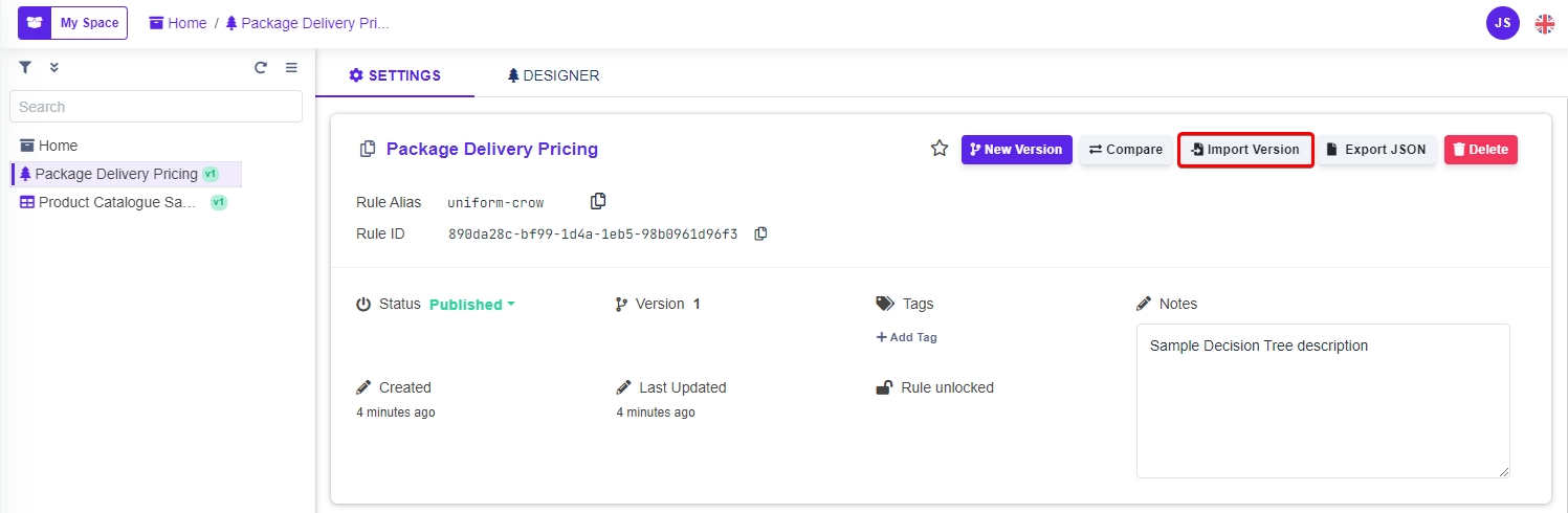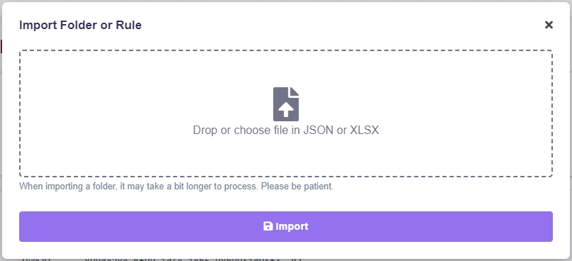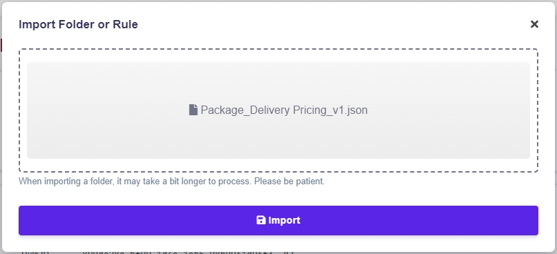 After selecting the method of import, drag and drop your rule file into the dashed area or click within it to open a File Explorer. For Decision Trees, the rule file can only have the format of JSON.
