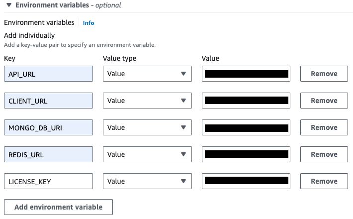 An important part of creating Task definitions is providing each Task definition with necessary environment variables. Each of the containers (Server, client and BI) have a set of mandatory environment variables that have to be provided for your application to run properly. Read about them here.