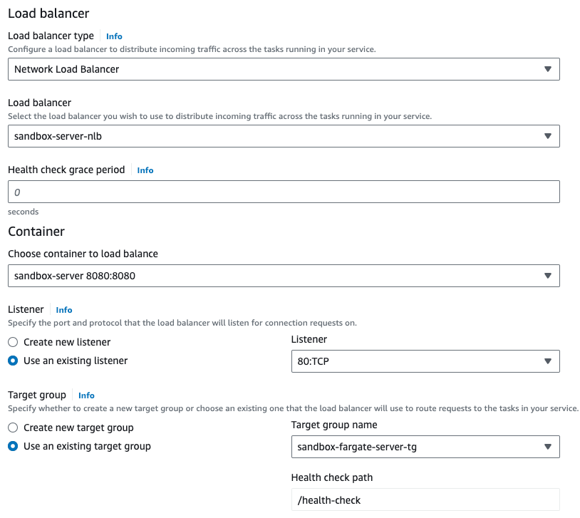Next in the Networking section choose your VPC, it's subnets and the your custom security group. In the Load Balancing section choose the Load Balancer you've created specifically for the service you're creating (i.e.: Server NLB for the Server service etc.) and importantly set the Health check grace period to 30 seconds. Next in the Listener part of your Networking settings choose Use an existing listener and pick the one you'd created previously. When creating the Server or BI services, fill in the Health check path with '/health-check', leave it empty for the client container.