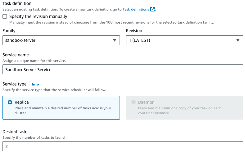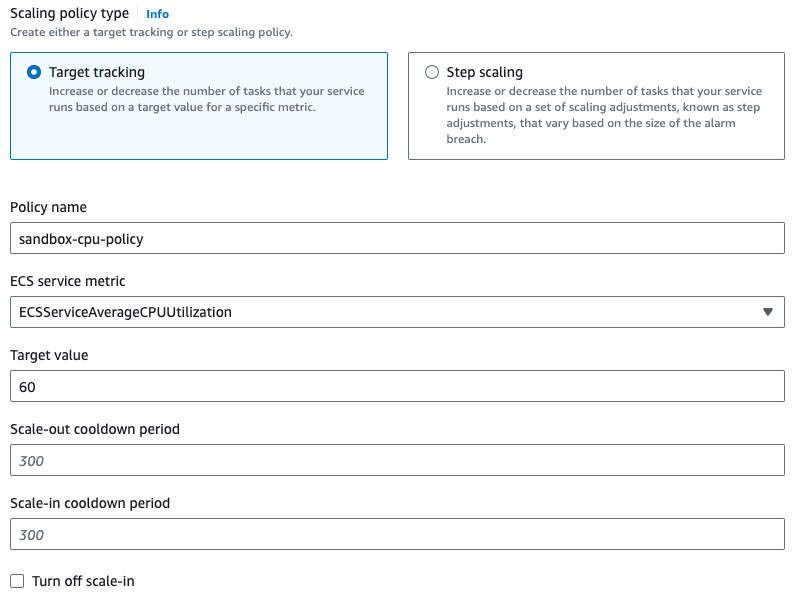 Lastly the Service auto scaling section. This is especially important for use cases which an be expected to put a significant load unto the server. I would recommend setting it to minimum of 2, maximum of 10 tasks. For the policy use ECSServiceAverageCPUUtilization and set the target value depending on your use case.