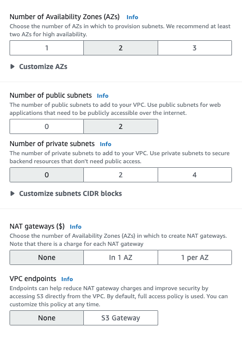 Choose to deploy to 2 AZs and for simplicity we're going to create a VPC without private subnets. Choose None for NAT gateways and VPC endpoints.