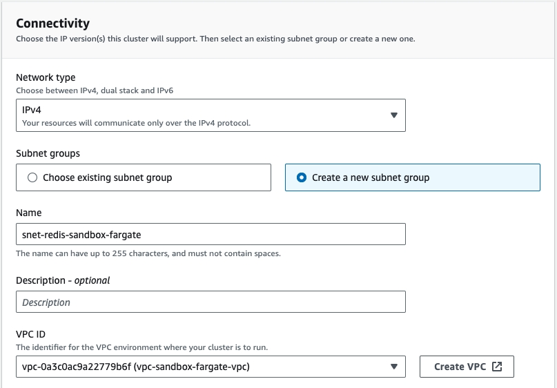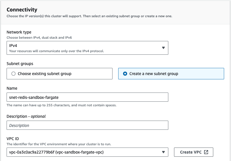 Next in Connectivity choose Create a new subnet group, give it a name and choose your VPC.