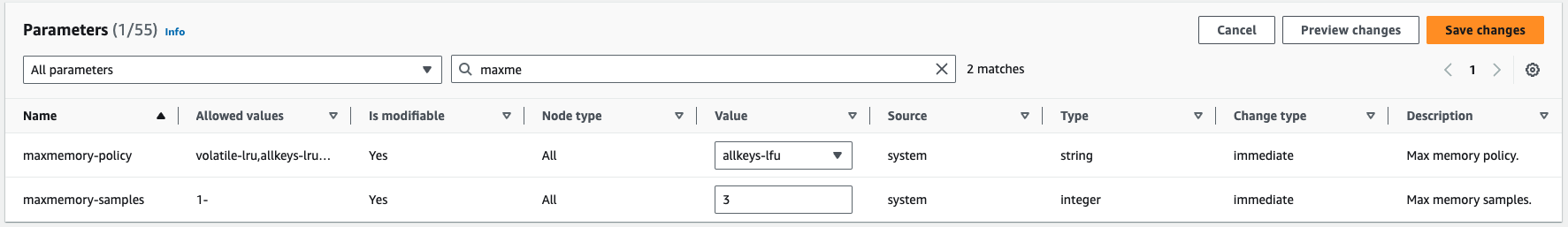 Go to the newly created parameter group and click **Edit parameter values.** Search for **maxmemory-policy**. For the value of this policy select either **allkeys-lfu or allkeys-lru.** Hit **Save changes.**