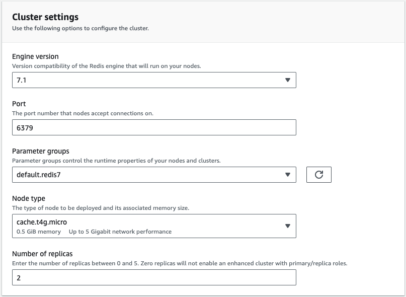 Choose a name for your cluster and continue to Cluster settings. There, keep everything default apart from the Node type where I recommend you choose **cluster.t4g.micro.**