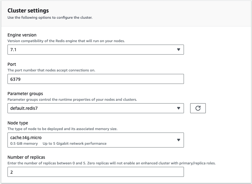 Choose a name for your cluster and continue to Cluster settings. There, keep everything default apart from the Node type where I recommend you choose cluster.t4g.micro.