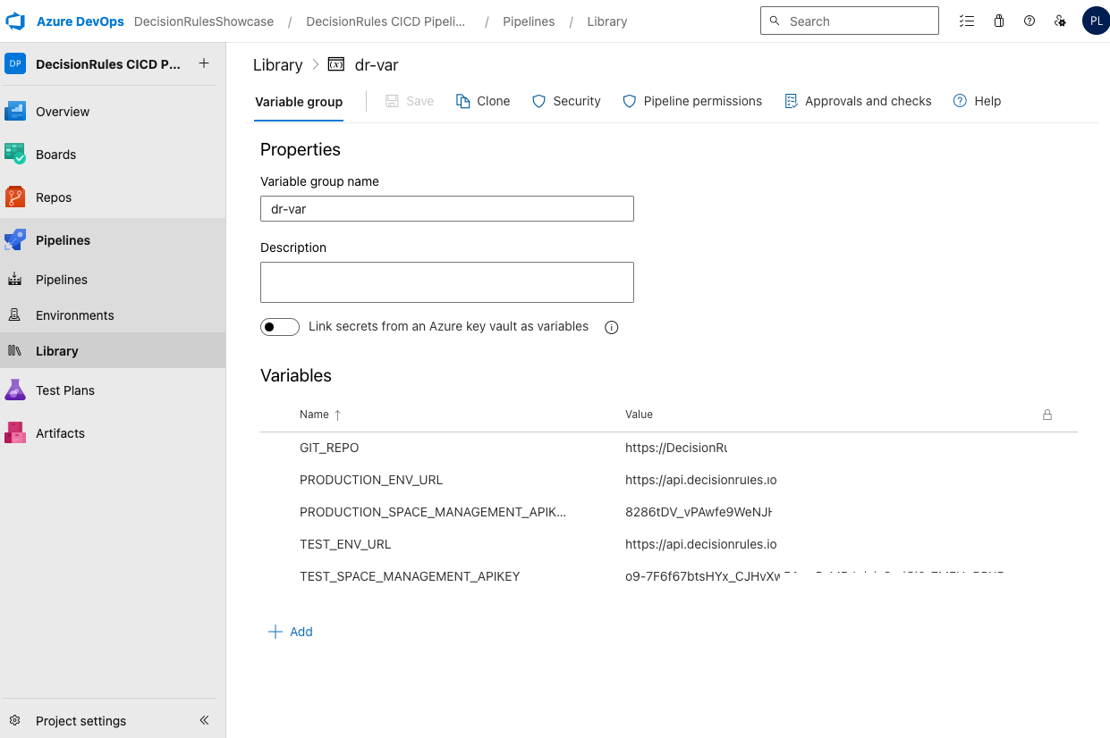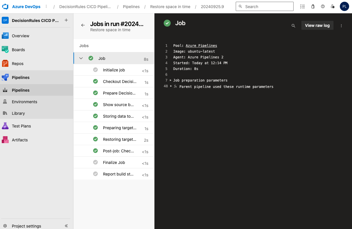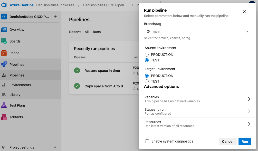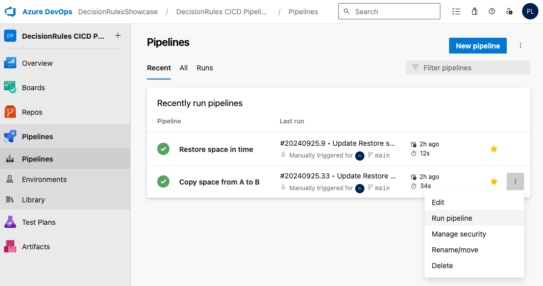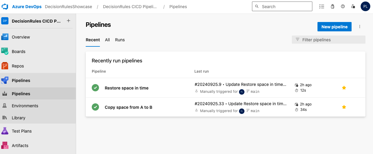 This tutorial will guide you through setting up two CI/CD pipelines using **Azure DevOps** CICD Pipelines to automate the management of business rules in **DecisionRules**. The first pipeline will handle moving business rules from one DecisionRules space to another, even across different environments (e.g., from development to production). The second pipeline will focus on **Restore-in-Time Recovery**, allowing you to revert to a previous state of your business rules when necessary.