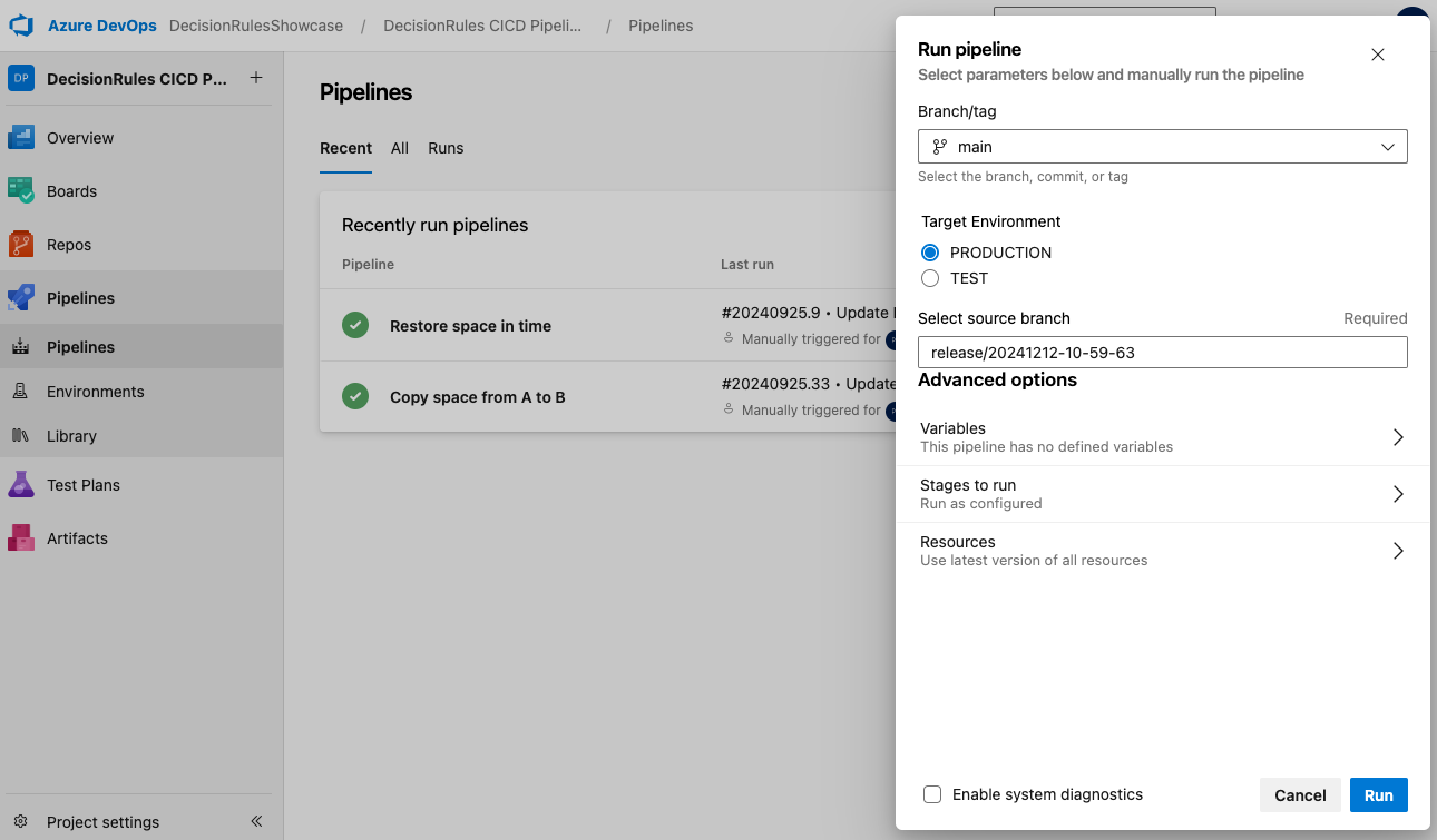 By setting up these two Azure DevOps pipelines—one for moving business rules between spaces and the other for time-based recovery—you can effectively automate rule management in DecisionRules. These pipelines will help you maintain consistent deployments, streamline environment management, and offer the ability to quickly revert to a previous rule state when needed.