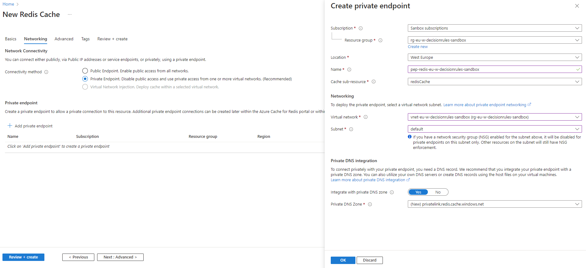 After selecting Private Endpoint click Add private endpoint and fill in the settings. Location and resource group settings should correspond to those of your server containers'.