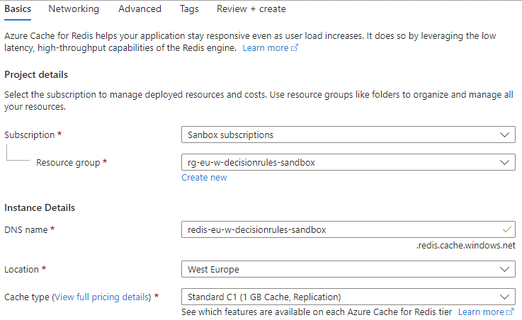 After navigating navigating to Azure Cache for Redis, hit Create. In the following screen assign your Resource group, give the cache a DNS name, choose a location and assing the Standard C1 type. The type selection is up to you but we recommend a cache with at least 1GB of storage.