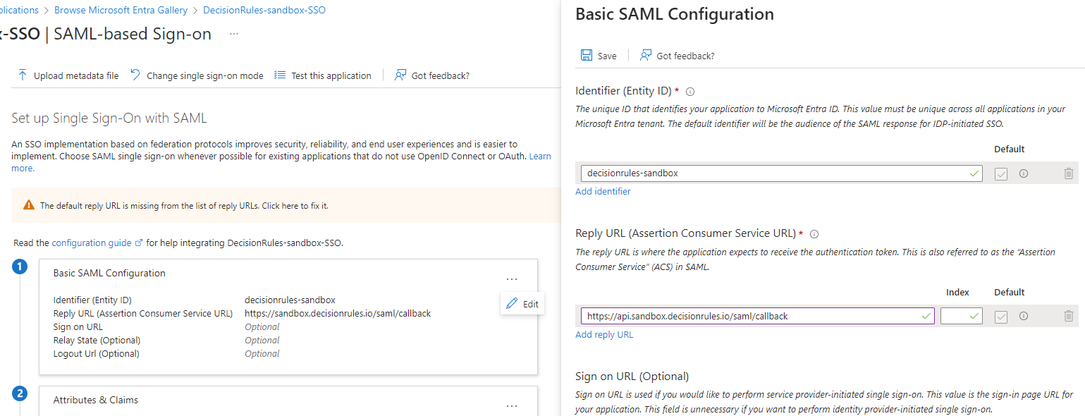 You will be presented with **SAML-based Sign-on** settings. We will mostly focus on the first part of these settings, the Basic SAML Configuration. When first setting the application up you will be required to provide the **Identifier (Entity ID)** and the **Reply URL**.