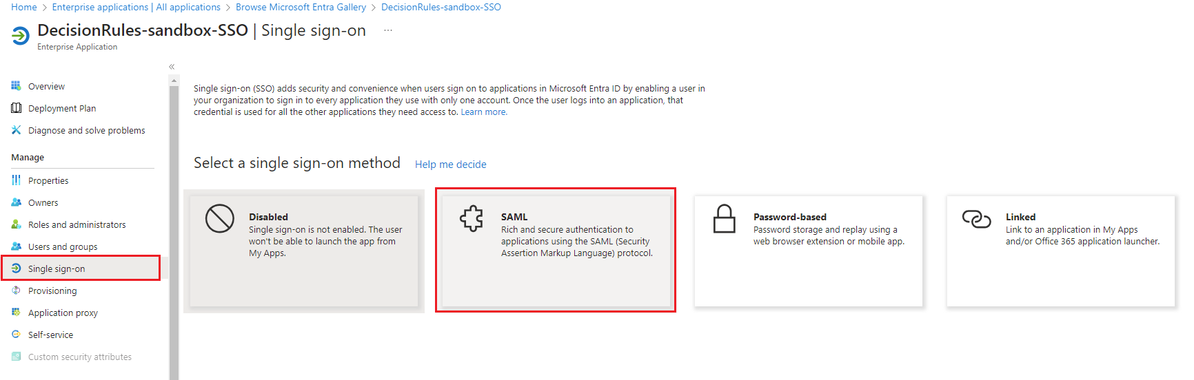 Once the application has been created select **Manage**/**Single sign-on**. From the methods, select **SAML**.