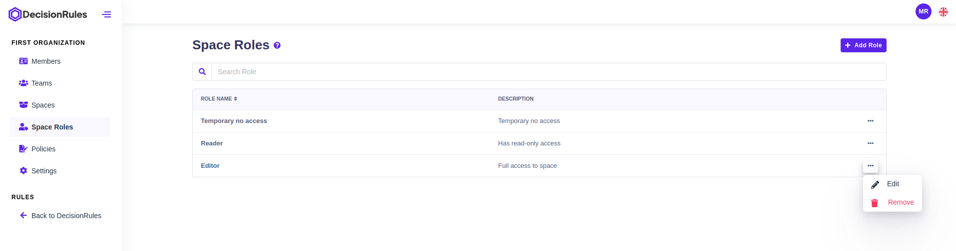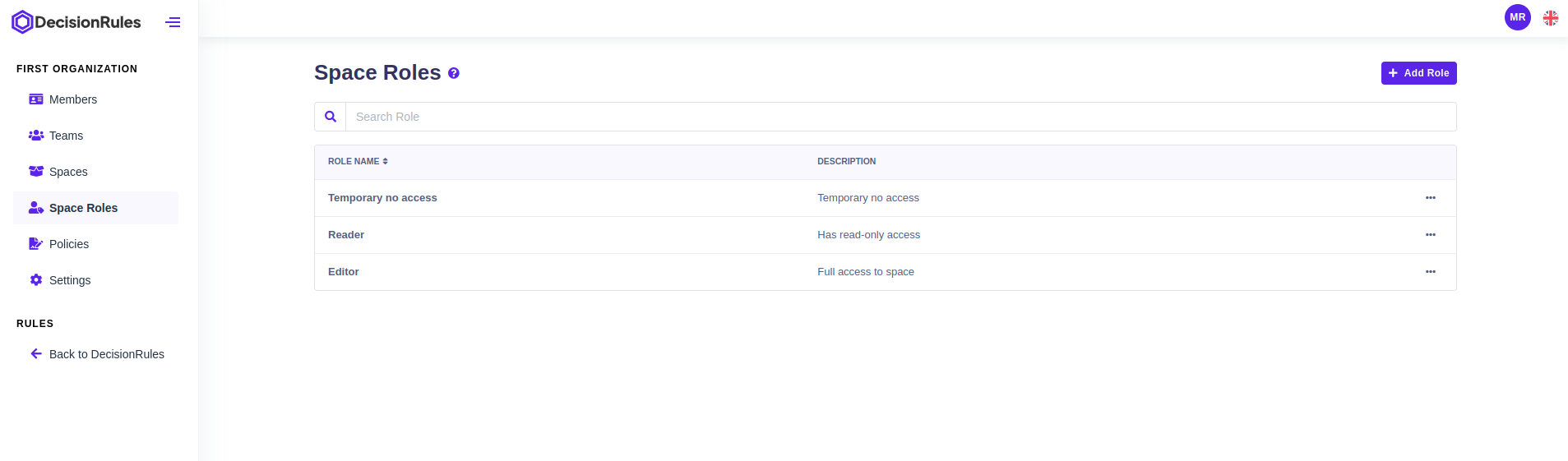 Space Roles within organizations define the permissions and capabilities that users have within specific spaces. Each Space Role grants different levels of access, allowing users to perform various actions based on their role. Space Roles ensure efficient collaboration, security, and resource management within individual spaces by regulating user permissions. Such roles are assigned to members or teams for a specific space when a policy is created.