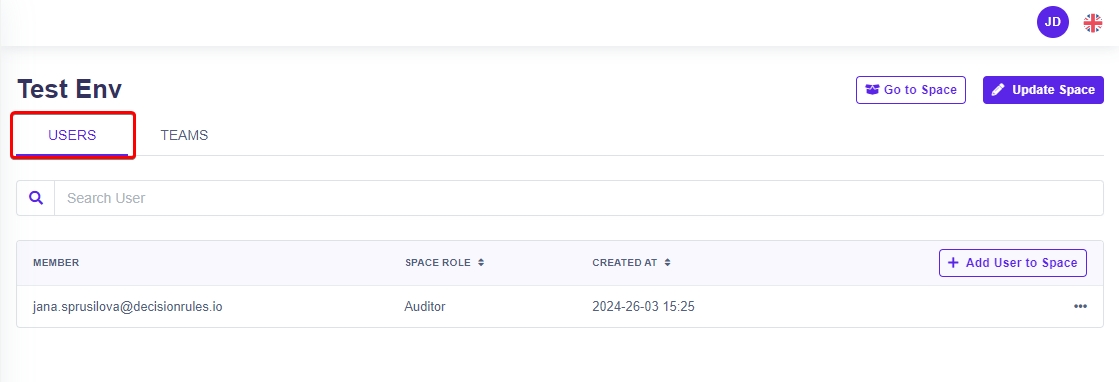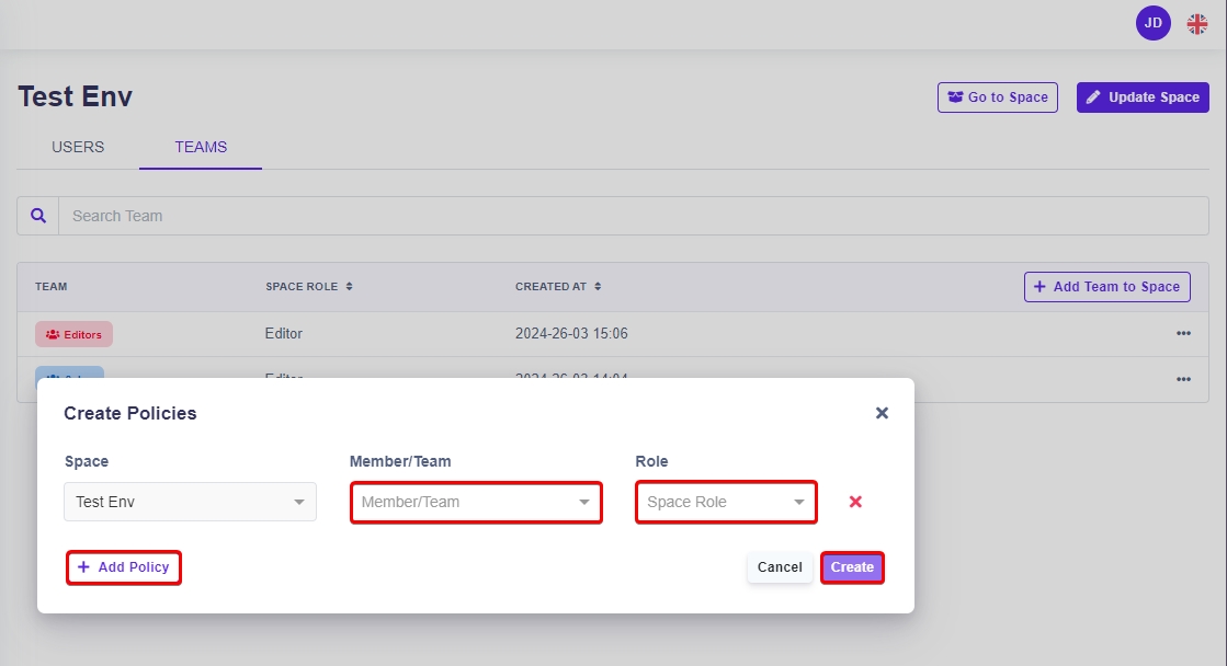 By clicking on "Add Team to Space" you can add existing organization team to selected space. In the window showed select a team and assign specific space role to it.