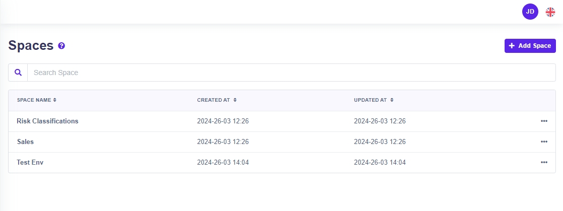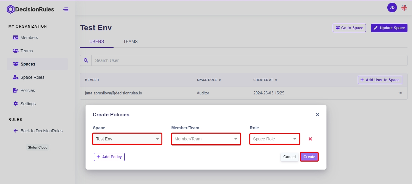 A new space can be added to the organization by pressing the "Add Space" button. A window for filling in the name of the new space will appear (required). Policies can be added to the newly created space in one step and access to the new space can be created directly. The creation of the space is confirmed by pressing the "Create" button. The newly created space appears in the list of all spaces in the organization.