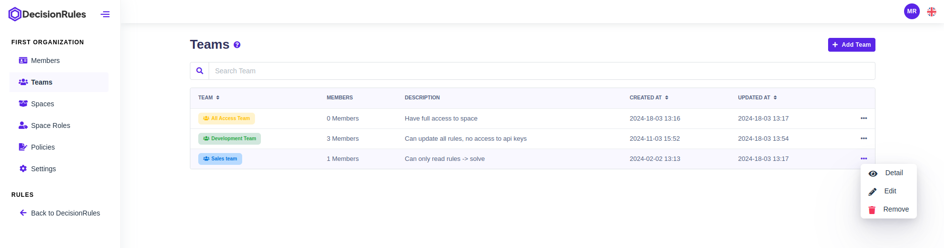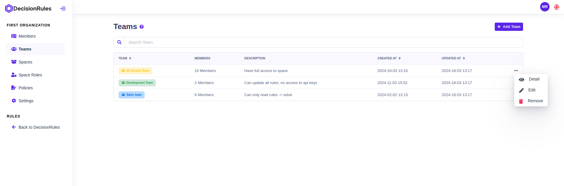 Created At - Displays the date and time when the team was created.