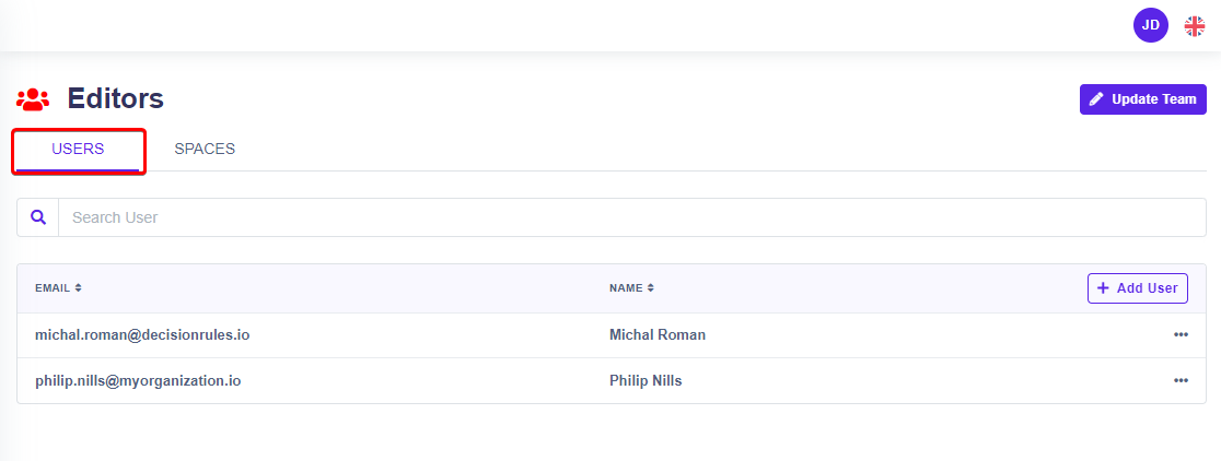 By clicking on button "Add user" you can add user to team.