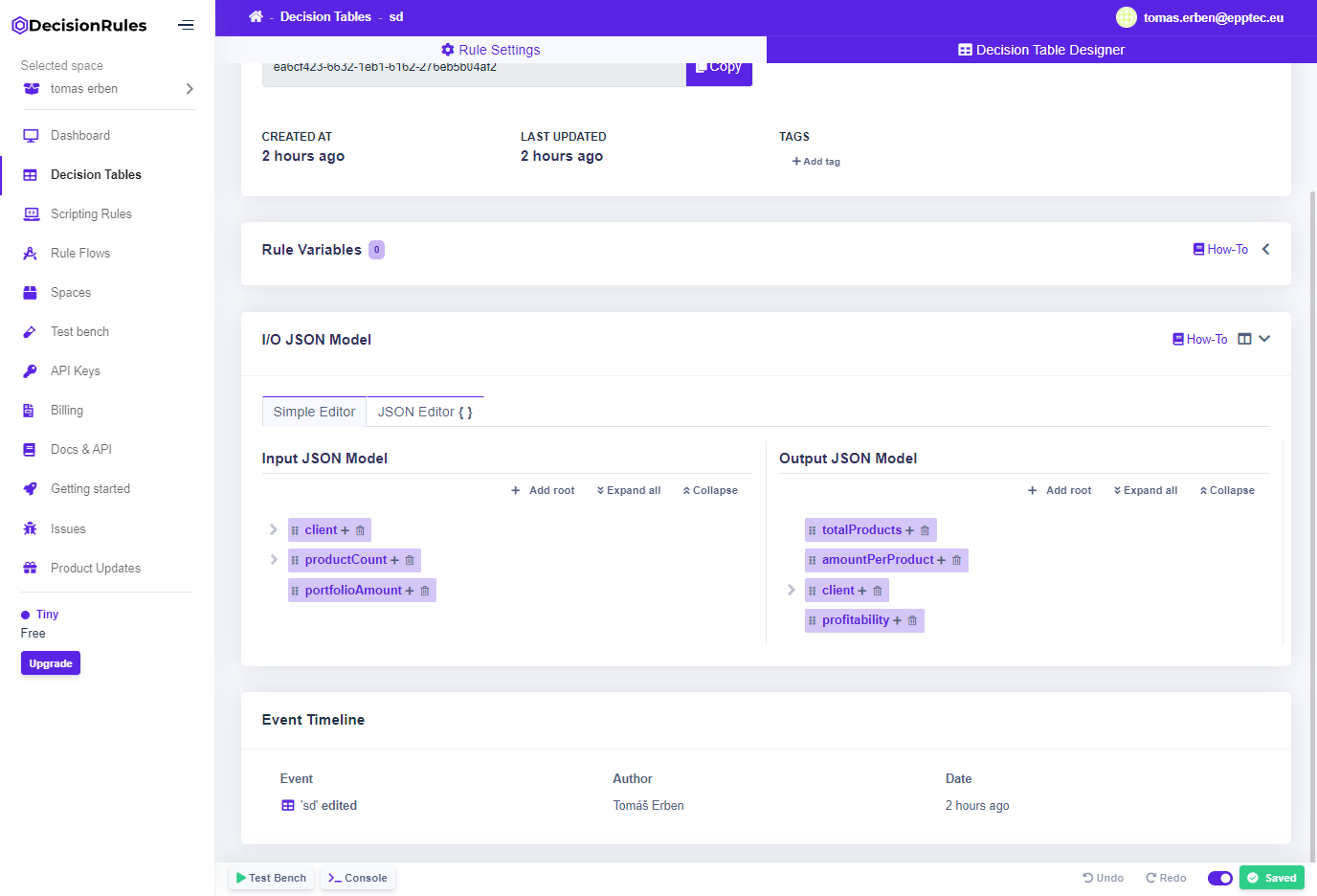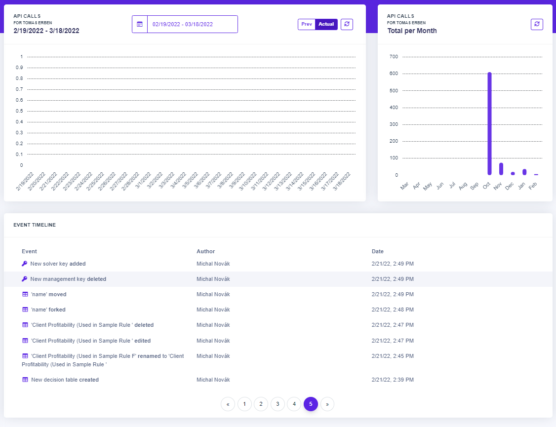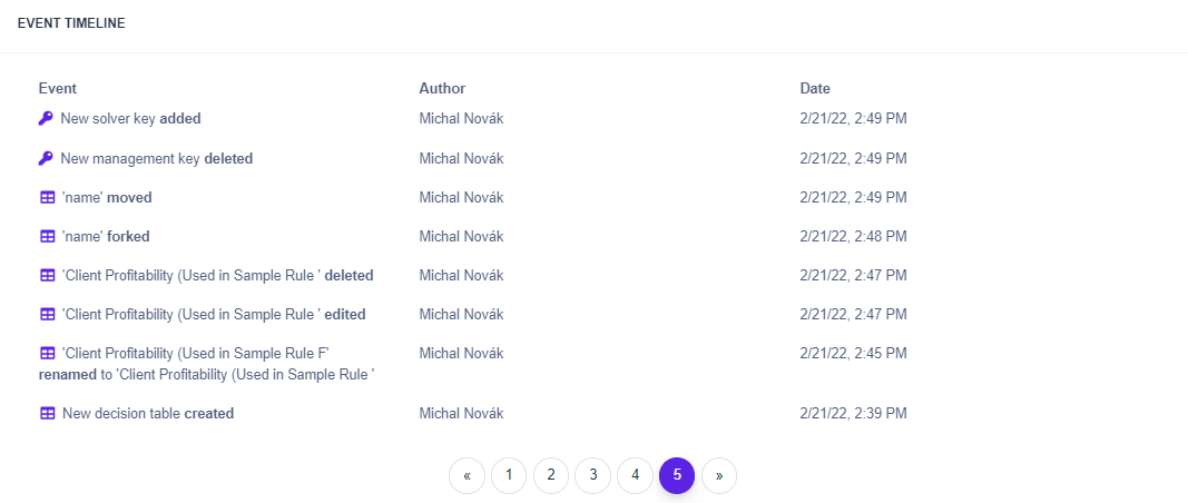 The event timeline widget can be found in the dashboard. These events include all the events that happened on the given space. Such events are any changes regarding decision tables, scripting rules and rule flows. Also any changes in the API KEYS section or editing of space are going to be logged here.