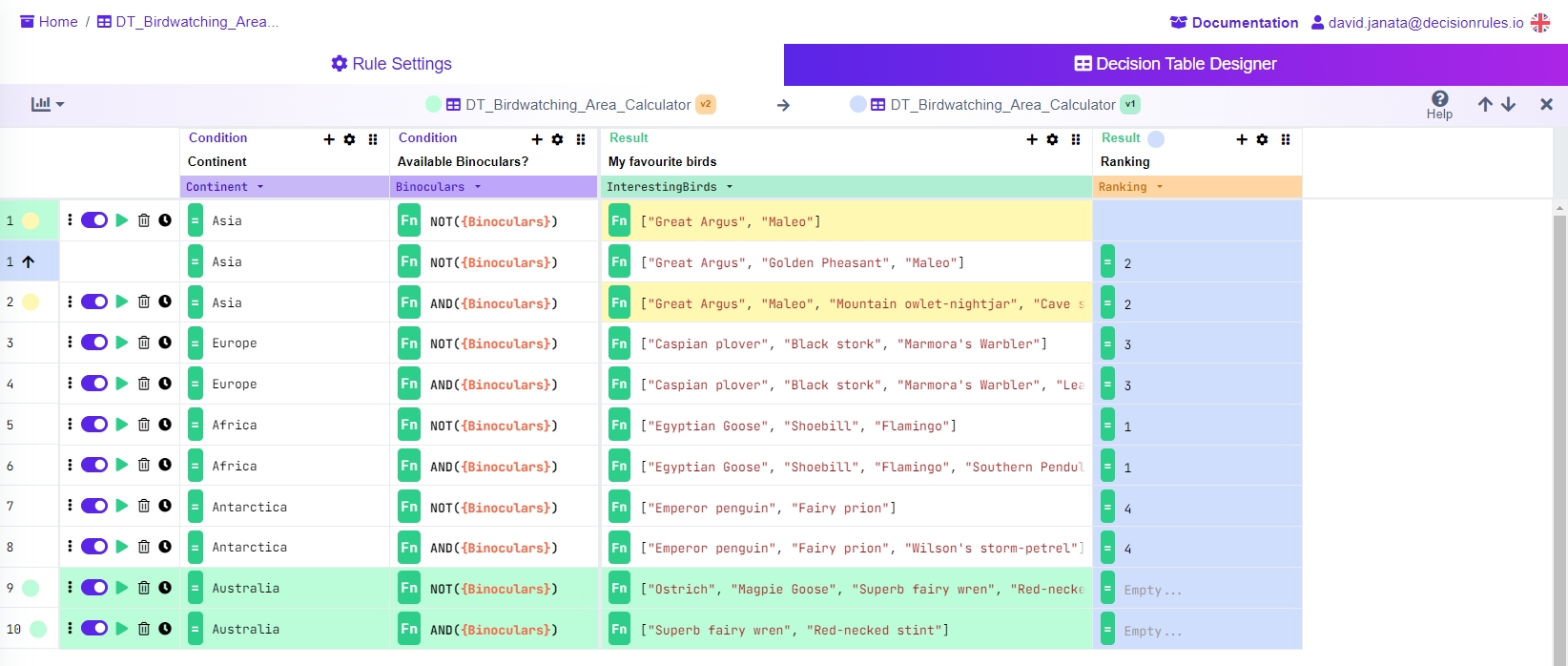 Since the comparison view is just a different rendering of the currently open rule you can still edit the table as you would outside of the comparison view. Changing cells' values, adding and removing rows and columns etc. is still all available and the comparison should change accordingly.