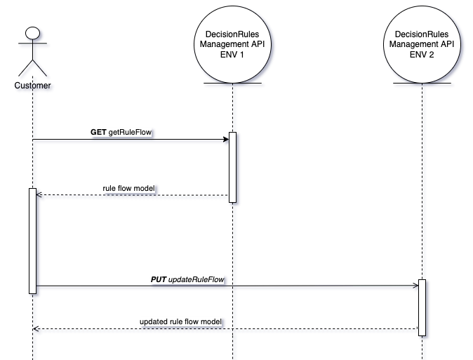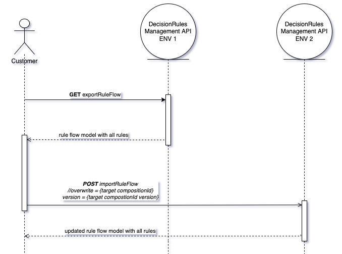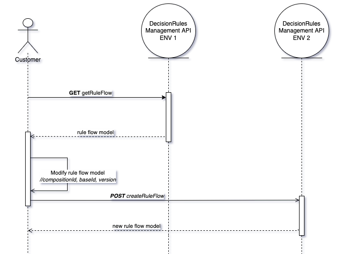 After you modify the rule flow model, you can create it in the target environment by HTTP POST method with path /api/rule-flow/import or with importRuleFlow method by SDK. You have to call this method with the parameter overwrite with a value of compositionId and parameter version with the value of the version which rule flow you want to update.
