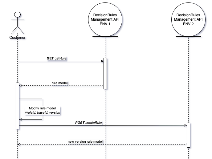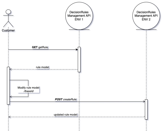 After you modify the rule model, you can create it in the target environment by HTTP POST method with path /api/rule or with createRule method in the SDK. As a response, you get a new rule model with newly generated ruleId, baseId, and version. More information about the HTTP POST method can be found at Create rule.