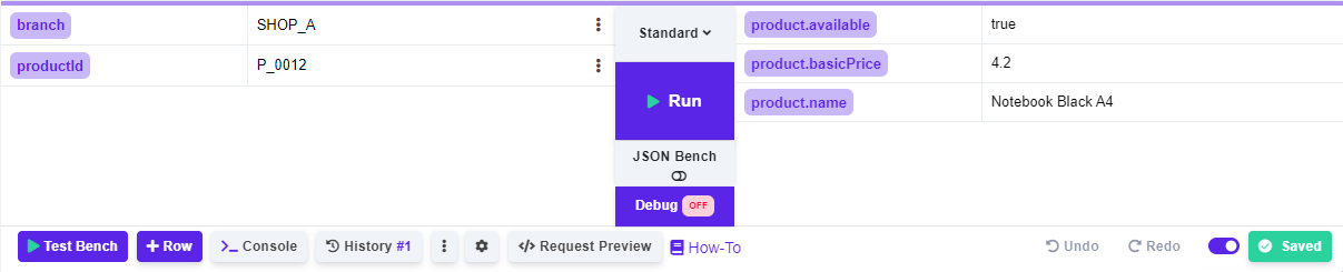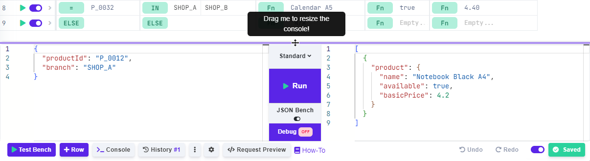 Test Bench works consistently across all rule types, ensuring a uniform testing experience. It comes in two variants. A user-friendly variant and the more technical JSON Bench. See the Decision Table Test Bench bellow as an example.