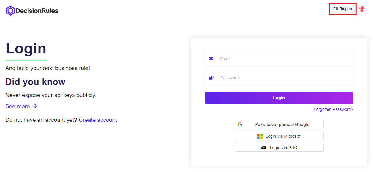 Accessing this version of DecisionRules is fairly straightforward. On the login page of DecisionRules, click the region dropdown in the top right.