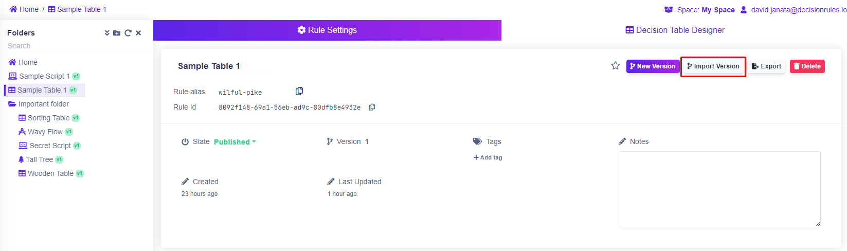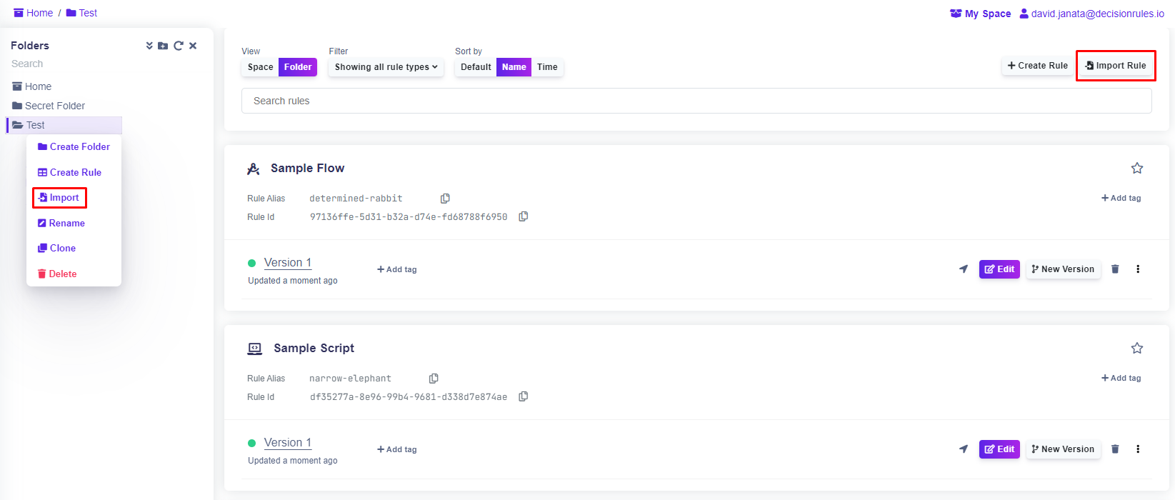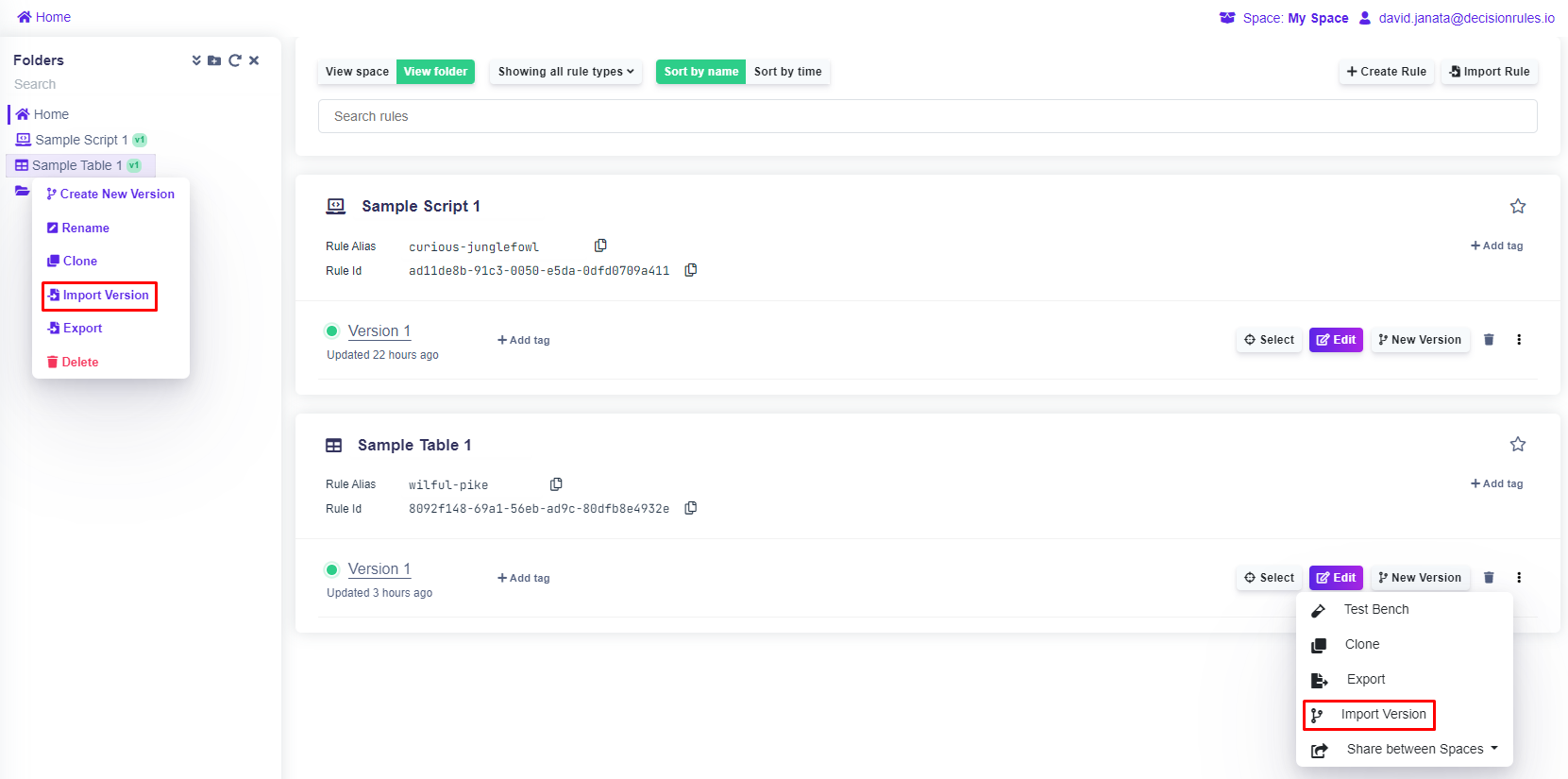 3. If there are any rules with the same rule ID but none of them has the same version as the rule that you just imported through the rule flow, then it will create a rule with the rule ID that it currently has inside the space and it will import it as the version that it has.