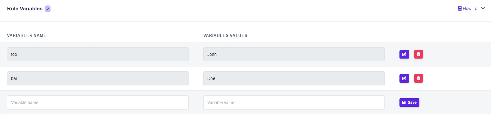 Rule Variables can be defined in Rule Settings section in scripting rule editor. All you need to do is to just simply define name and value of scripting variable.