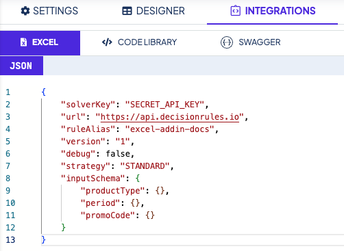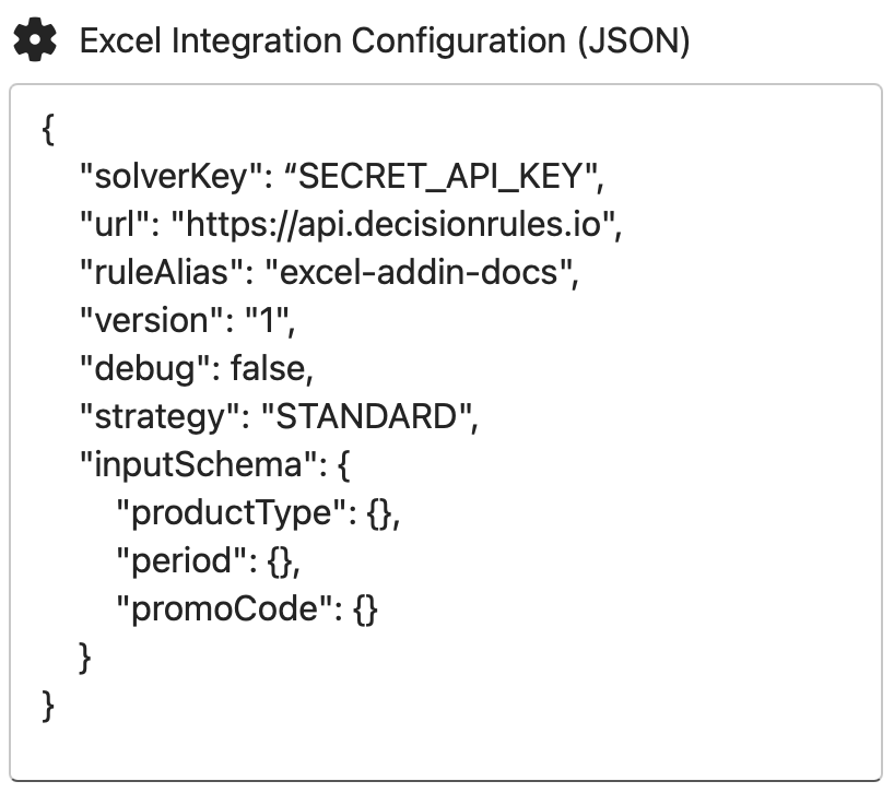 This configuration connects your Excel sheet to the DecisionRules API, defines the rule to be solved, and specifies the input schema required.